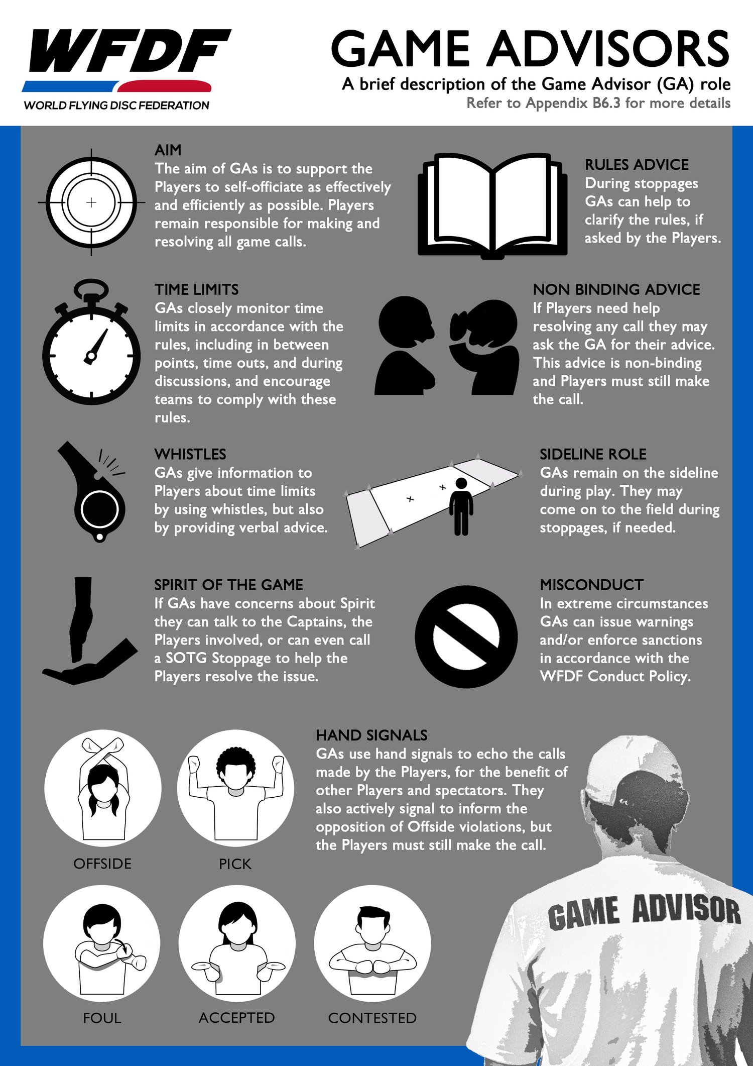 Below you can find the WFDF pamphlet about the Game Advisors role.